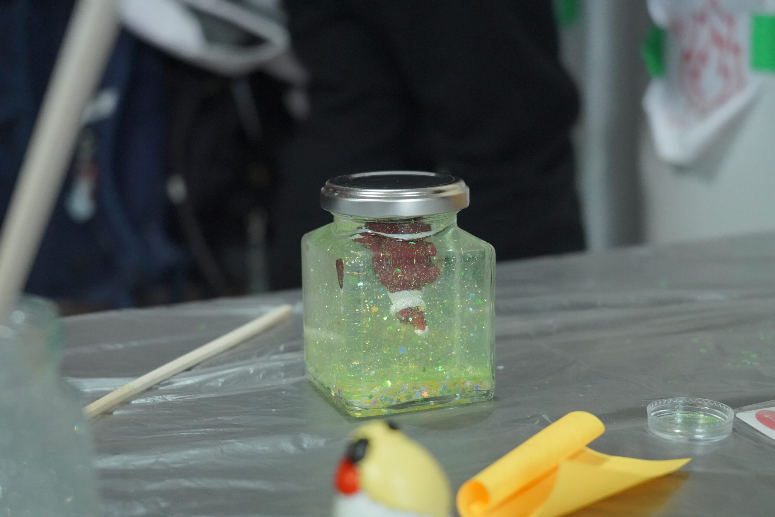 午後はスノードーム作り! キラキラのラメやスパンコール、人形を瓶の蓋に貼り付けたりしてそれぞれの個性あふれるスノードームを真剣な表情で作っていました。