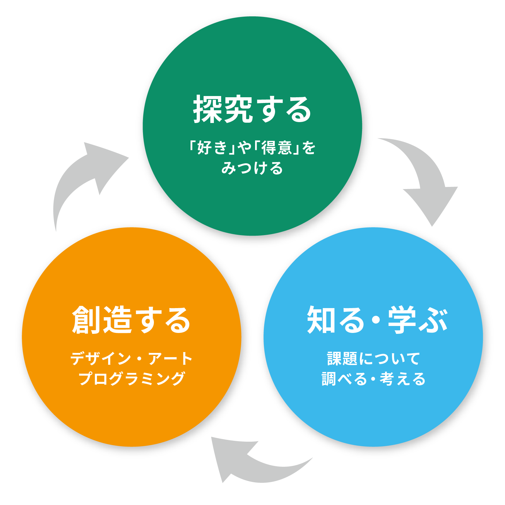 ティンカリングベースは、ワクワクするクリエイティブ活動とたくさんの体験を通して、「探究する」→「知る・学ぶ」→「創造する」がサイクルし続ける活動を実践しています。